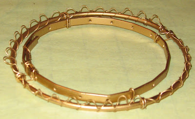 then I took the brass frame outside and started pounding apart the rings with the predrilled holes in them that I wanted to reuse on my two new chandeliers. Here are those parts shown below. I cut open the old metal circles so that I could make them smaller. I simply wrapped wire to secure the ends together to keep the new/smaller circle shapes.